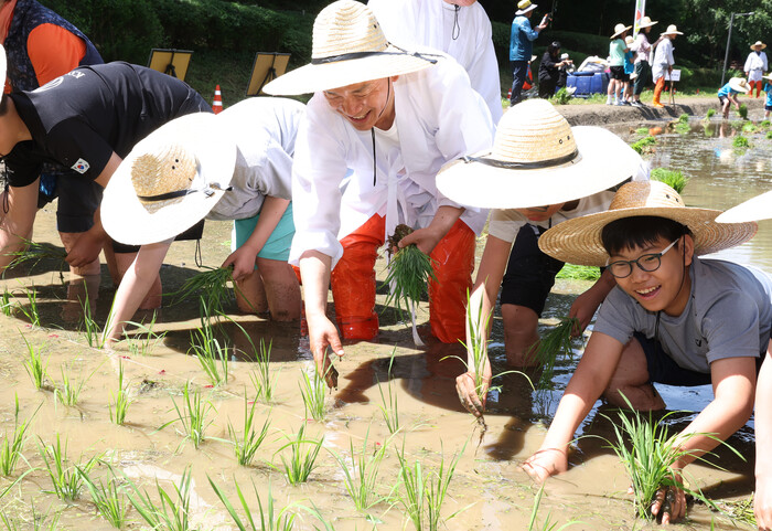 [시민일보 = 이대우 기자] 서울 강남구(구청장 조성명)가 27일 오전 10시~낮 12시 양재천 벼농사학습장(영동4교 부근)에서 전통 손 모내기 체험 행사를 개최했다.