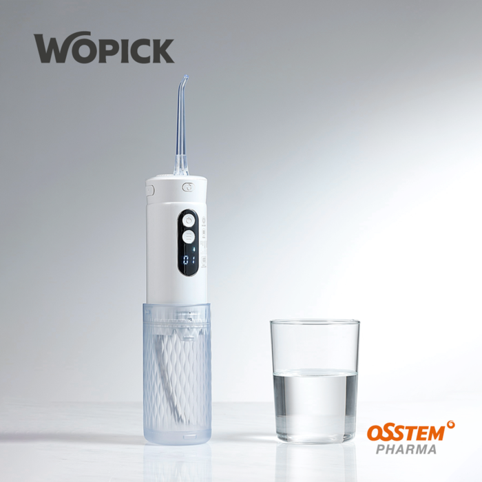 오스템파마에 따르면 물통을 분리하여 본체와 포개는 방식으로 보관하는 ‘와픽 핸디 구강 세정기’는 스마트폰과 유사한 크기며, USB 충전 방식의 무선 제품이다. 본체의 LCD 화면을 통해 베터리 잔량과 수압을 직관적으로 확인할 수 있다.