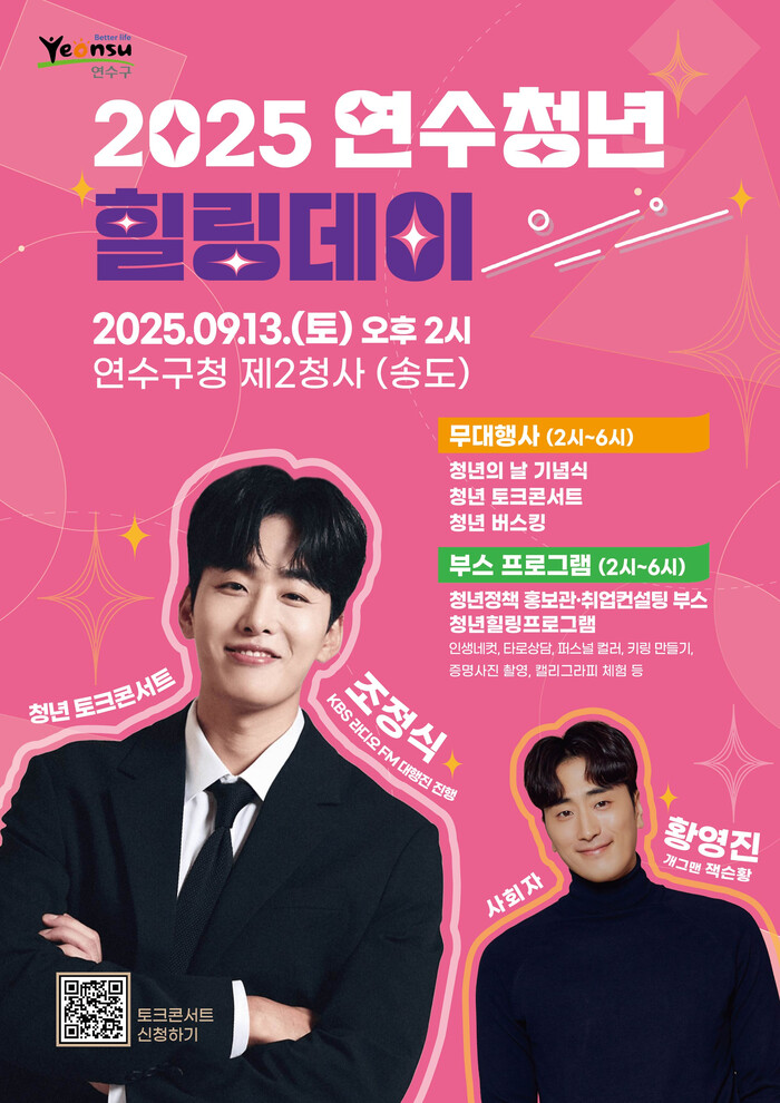 올해 토크콘서트에는 SBS 아나운서 출신 방송인 조정식이 참여해 꿈을 이루기 위한 노력과 경험을 주제로 연수구 청년들에게 들려주고 싶은 이야기와 청년 고민 상담 등 진솔한 이야기를 나눌 예정이다.