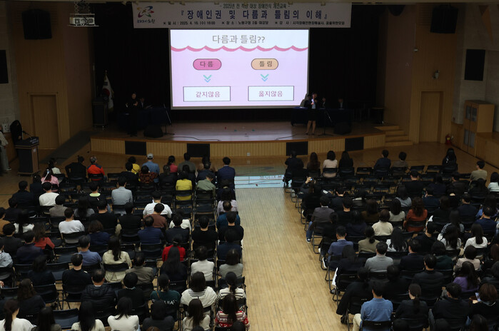 | ▲ 16일 장애인식 개선 교육을 진행하는 모습. (사진=노원구청 제공) |