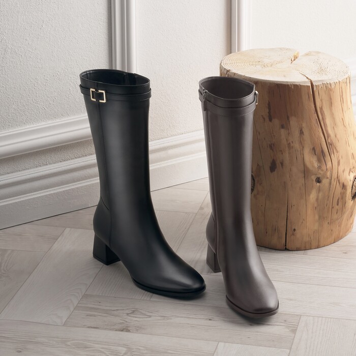 부츠 옆라인의 스티치 디테일이 다리를 길어 보이게 하는 효과를 주며 차분한 컬러감의 가죽에 버클 장식으로 포인트를 살렸다. 또한 부드러운 터치감의 내구성 좋은 소가죽을 사용해 부츠 특유의 세련된 느낌을 강조했다.