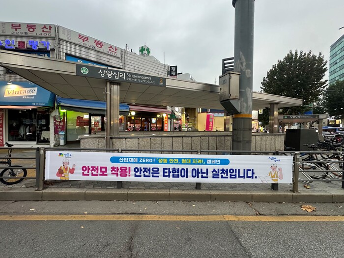 | ▲ 상왕십리역 2번출구 앞에 게시된 안전모 착용 캠페인 홍보 현수막. (사진=성동구청 제공) |