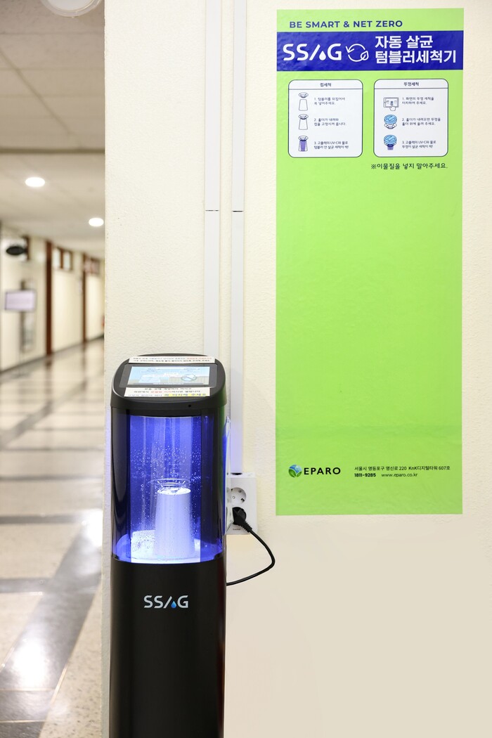 이번에 설치된 세척기는 컵 본체와 뚜껑을 1분 이내로 고온 살균 세척이 가능해 위생적이고 편리하게 사용할 수 있으며, 텀블러 외에도 머그컵, 물병 등 다양한 컵을 사용할 수 있어 활용도가 높다.