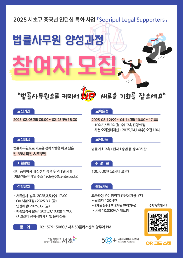 [시민일보 = 박소진 기자] 서초구(구청장 전성수)가 중장년을 위한 법률사무원 인턴십 프로그램인 ‘서리풀 리걸 서포터즈(Seoripul Legal Supporters)’ 참여자를 오는 28일까지 모집한다고 밝혔다.