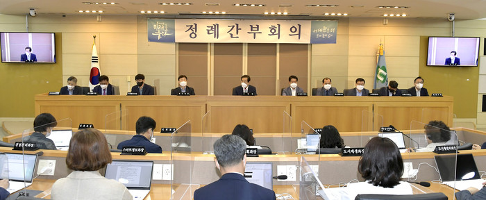 문석진 서울 서대문구청장이 최근 민선 5~7기 서대문 구정의 마지막 정례 간부회의를 주재했다. 사진은 문 구청장(가운데)이 마지막 정례 간부회의를 주재하고 있는 모습. (사진제공=서대문구청)
