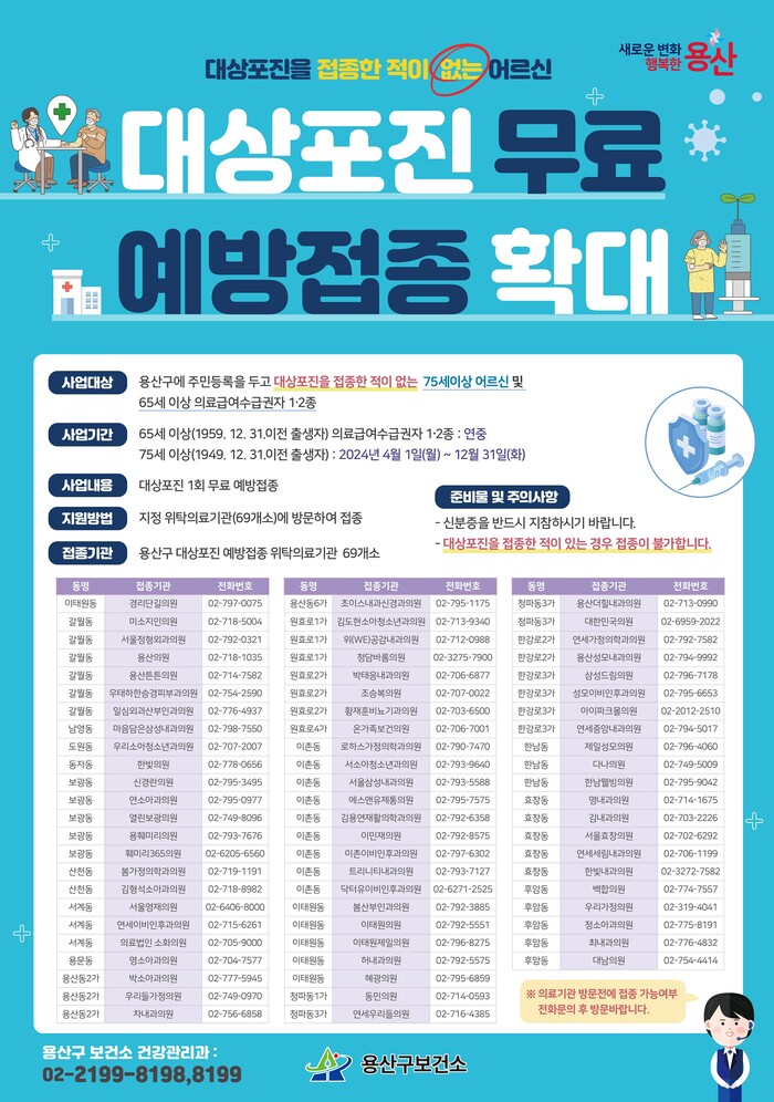 접종 희망자는 신분증과 수급자 증명서를 필히 지참해 지역 위탁의료기관으로 지정된 동네 병의원 69곳에서 무료로 접종받을 수 있다. 위탁의료기관 정보는 용산구청 누리집에서 확인할 수 있다.