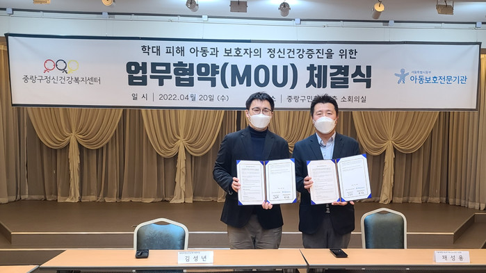 서울 중랑구가 최근 학대 피해 아동의 회복을 돕기 위해 서울시 동부아동보호전문기관과 ‘학대 피해 아동 심리지원을 위한 업무협약’을 체결했다. 센터는 협약을 바탕으로 학대 피해 아동을 위한 정신건강상담, 심리검사 지원 및 맞춤형 사례관리 서비스를 제공할 예정이다. 사진은 협약식에서 관계자들이 기념촬영을 하는 모습. (사진제공=중랑구청)