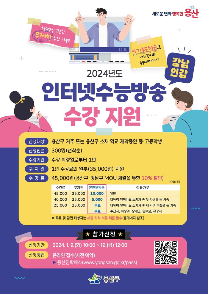 [시민일보 = 홍덕표 기자] 서울 용산구(구청장 박희영)는 지역 학생들의 학습 격차를 해소하고 사교육비 부담을 줄이기 위해 '2024년 인터넷 수능방송' 수강료를 지원한다고 9일 밝혔다.
