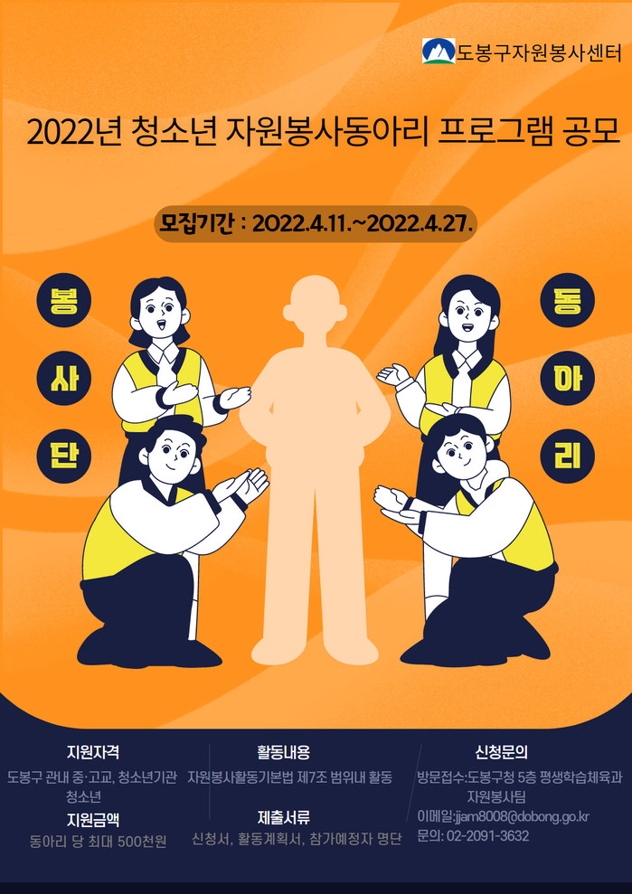 [시민일보 = 박준우 기자] 서울 도봉구(구청장 이동진)가 청소년의 자원봉사 활동을 지원 및 활성화하고자 '2022 청소년 자원봉사동아리 프로그램'을 공모한다고 14일 밝혔다.