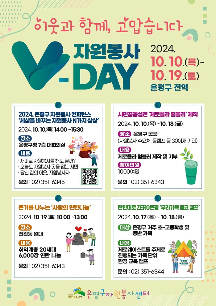 ▲2024 은평구 자원봉사 컨퍼런스 ▲시민공동실천–제로플라 텀블러 제작 프로그램 ▲ZERO은평, 우리가족 에코 캠프 ▲온기를 나누는 ‘사랑의 연탄 나눔’ 등으로 구민들을 만날 예정이다.