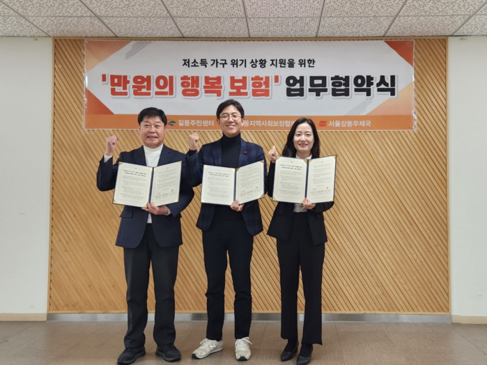 [시민일보 = 이대우 기자] 강동구(이수희 구청장) 길동은 지난 1월31일 길동주민센터에서 ‘만원의 행복 보험’ 업무협약식을 개최하고 길동지역사회보장협의체, 서울강동우체국과 함께 저소득 가구의 위기 상황 지원에 나선다고 밝혔다.