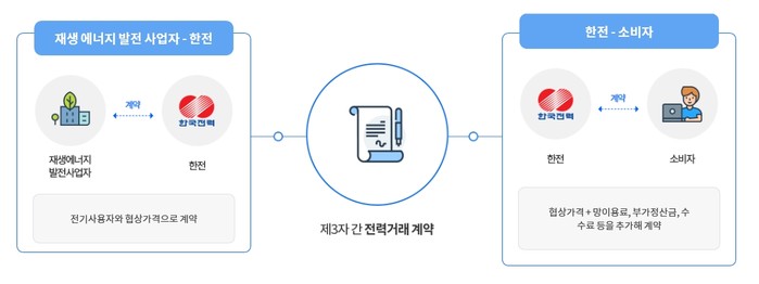 제3자간 PPA는 재생에너지 발전사업자와 전기사용자간 합의내용을 기초로 한전이 발전사업자와 구매계약을, 전기사용자와 판매계약을 각각 체결하여 재생에너지 전력을 제3자간에 거래하는 제도다.