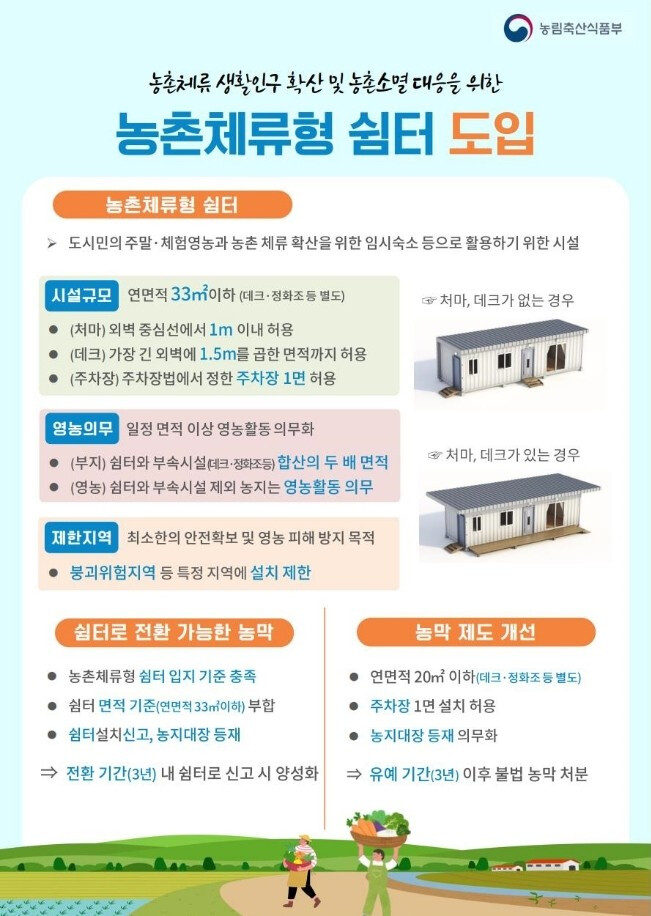 농촌체류형 쉼터는 농지 내 총면적 33㎡ 이내에서 설치할 수 있으며, 주차공간과 데크, 정화조 등 부대시설 설치가 가능하다. 농림축산식품부 지침에 따라 현황도로 등에 연접해 소방차 진출입이 가능해야 하며, 소방 및 안전기준 강화를 위해 소화기와 감지기 등 화재 안전시설 설치를 의무화하고 재난 위험 지역 내 설치는 제한한다.