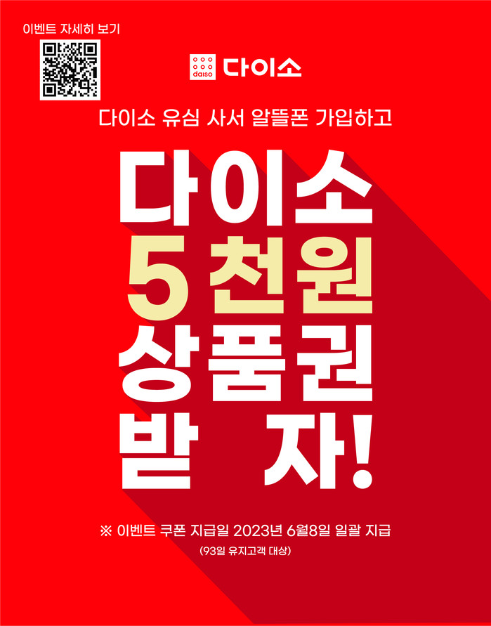 93일 이상 요금제를 유지한 고객들에게 1인당 1회선에 한해, 다이소 모바일 상품권 5000원권을 오는 6월8일부터 증정한다.