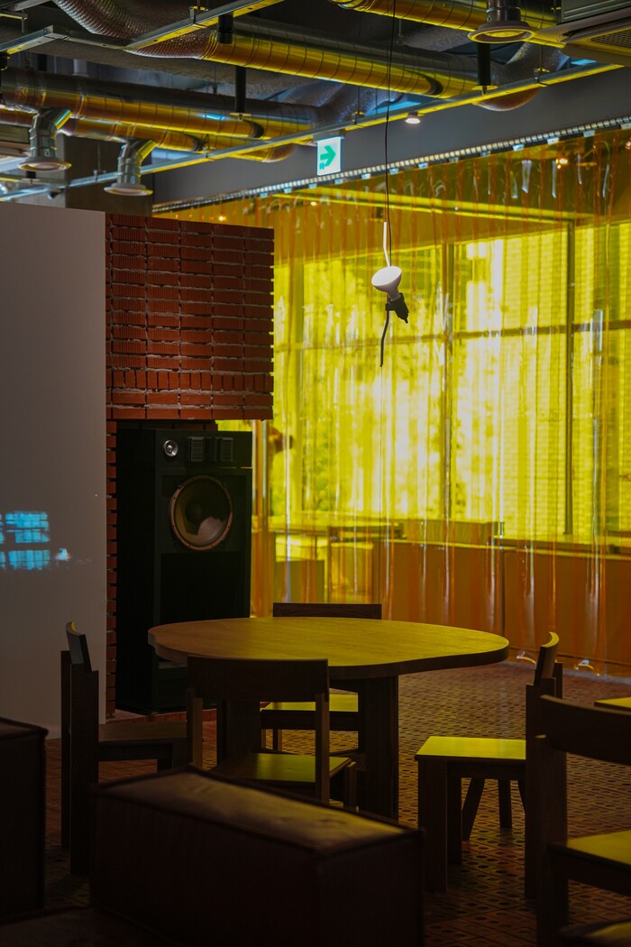 시멘트와 스테인리스 스틸, 우드와 PVC 등 언뜻언뜻 믹스 매치된 소재가 눈에 들면서 블루-옐로-레드의 컬러 플레이도 놓치지 않았다. 앞선 두 매장이 보여준 성긴 미감의 기조는 이어가면서 벽돌을 중심으로 편안함과 향수를 강조했다.