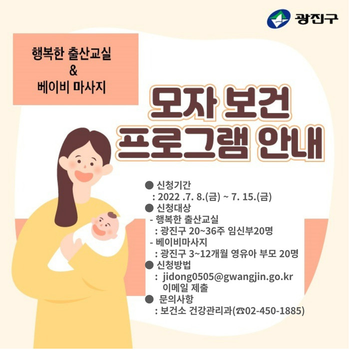 ‘행복한 출산교실’과 ‘엄마랑 아기랑 건강 UP’은 오는 15일까지 담당자 이메일(jidong0505@gwangjin.go.kr)로 신청할 수 있으며, 20명씩 선착순 마감한다.