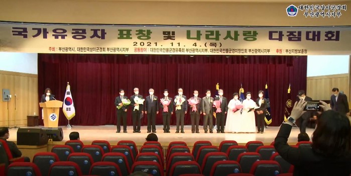 대한민국상이군경회 부산광역시지부(지부장 김선일)는 지난 4일 오후 1시 부산시청 대강당에서 국가유공자와 보훈가족을 초청하여 2021년 국가유공자 표창 및 나라사랑 다짐대회 행사를 가졌다.
