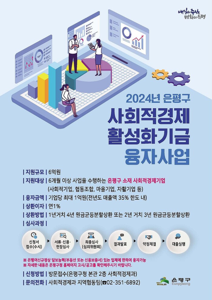 [시민일보 = 이대우 기자] 은평구(구청장 김미경)가 총 6억원 규모의 ‘2024년 사회적경제활성화기금 융자사업’을 실시한다.