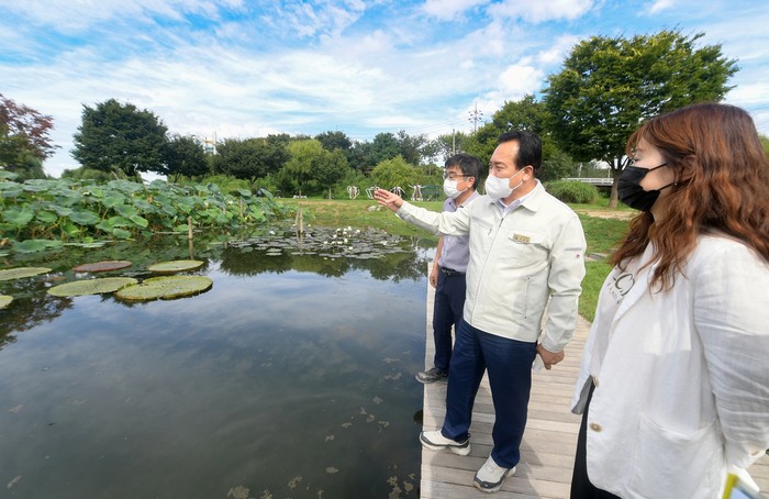 이권재 경기 오산시장은 최근 오산천 시민친화형 친수하천 추진을 위한 향후 구상을 위해 현장방문을 했다. 이 시장은 오산천의 휴식 등 활용 방안에 대해 시민들과 직접 소통하며 현장을 꼼꼼히 확인했다. 사진은 오산천에서 이 시장(가운데)이 관계자들과 대화를 나누고 있는 모습. (사진제공=오산시청)