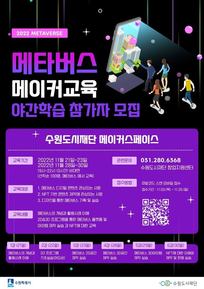 메타버스 플랫폼(게더타운)을 활용한 비대면 교육으로 이뤄지며, 청소년·성인 등 100명을 모집한다. 교육 홍보물의 큐알 코드를 스마트폰으로 스캔해 신청할 수 있다. 무료 교육이다.