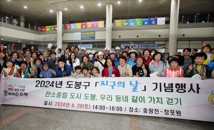 도봉구는 최근 제54회 세계 지구의 날을 맞아 ‘탄소중립 도시 도봉, 우리 동네 같이 가치 걷기’ 행사를 개최했다. 참여자들은 탄소중립 실천을 다짐하고 환경퀴즈 등 다양한 탄소중립 미션을 수행했다. 사진은 오언석 구청장(앞줄 왼쪽 다섯 번째)과 참가 구민들이 기념촬영을 하고 있는 모습. (사진=도봉구청 제공)