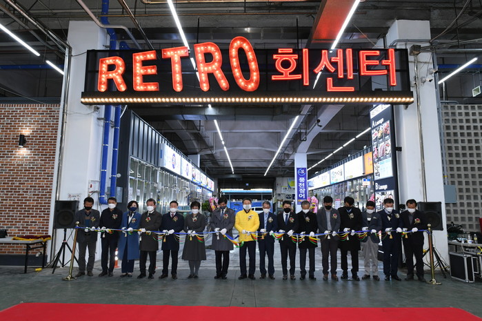 경기 구리시가 최근 수산시장 활성화와 일자리 창출을 위해 구리농수산물도매시장 수산동 15곳의 활어·대게·장어 등 전문점에서 안전하고 신선한 수산먹거리를 합리적인 가격으로 즐길 수 있는 '레트로 회센터'를 개장했다. 사진은 개장식 행사에서 안승남 시장(왼쪽 여덟 번째)과 관계자들이 테이프 커팅을 하고 있는 모습. (사진제공=구리시청)