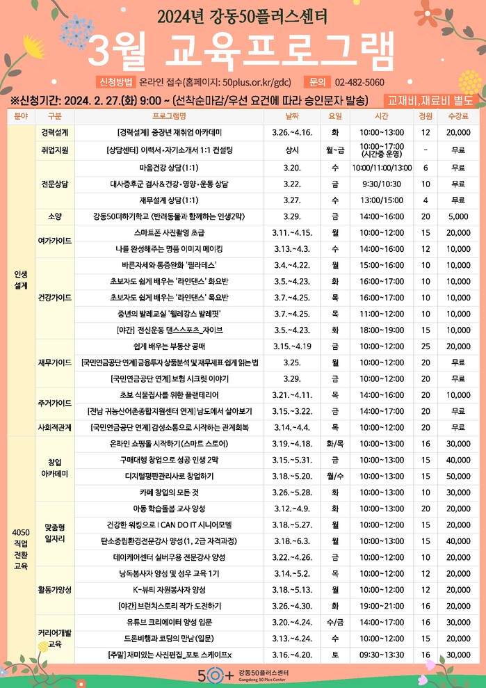 프로그램은 강동50플러스센터 홈페이지에서 선착순으로 신청 받으며, 40~64세 강동구민을 우선 모집한다.