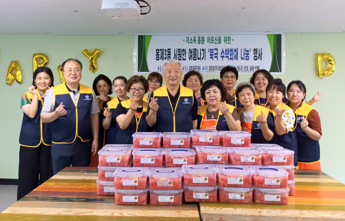 [시민일보 = 이대우 기자] 서울 서대문구 홍제3동은 최근 동 지역사회보장협의체가 지역 내 저소득 홀몸노인들을 위한 ‘시원한 북극 수박화채 나눔’ 행사를 진행해 주위를 흐뭇하게 했다고 밝혔다.