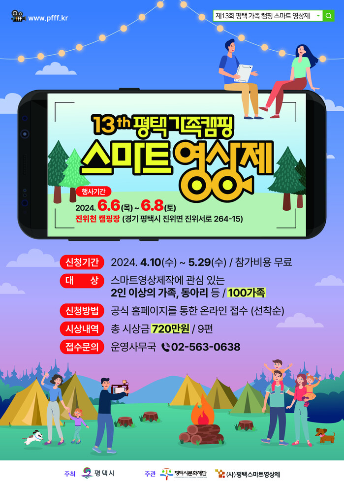 ‘제13회 평택 가족캠핑 스마트영상제’는 4월 10일(수)부터 5월 29일(수)까지 (사)평택스마트영상제를 통해 선착순으로 참가 신청이 진행된다. 신청 방법은 홈페이지에서 주제에 맞는 시나리오와 참가인원 등 을 작성한 후 서류심사 통과자에 한해 참가 신청이 완료된다.