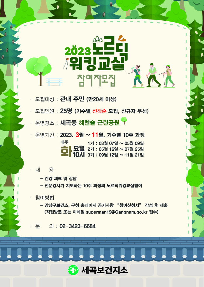 [시민일보 = 이대우 기자] 서울 강남구(구청장 조성명)가 양손에 스틱을 잡고 걷는 ‘노르딕워킹 교실 1기 참가자’를 오는 15일까지 모집한다.