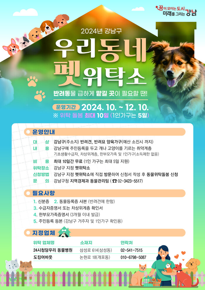 [시민일보 = 이대우 기자] 꿈이 모이는 도시, 미래를 그리는 강남구(구청장 조성명)가 올해 연말까지 우리 동네 펫 위탁소의 신청자를 모집한다. 올해 시범 운영하는 펫 위탁소는 병원 입원이나 여행 등으로 반려견·반려묘를 급하게 맡길 곳이 필요한 구민에게 제공되는 반려동물 돌봄 서비스다.