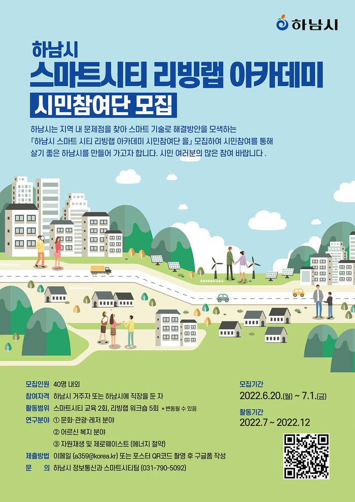 시민참여단 신청은 하남시 홈페이지에서 ‘리빙랩’ 검색 후 신청서를 내려받아 이메일로 접수하거나 홍보 포스터의 QR코드를 스캔 후 구글폼을 제출하면 된다.
