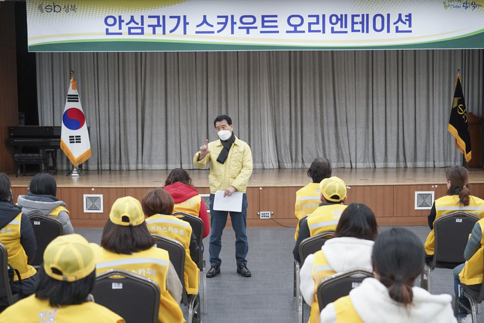 서울 성북구는 최근 안심귀가 스카우트 오리엔테이션을 실시했다. 오리엔테이션은 근무 요령과 주의사항 등 직무소양 교육과 질의응답, 성폭력 예방 교육 순으로 진행됐다. 사진은 이날 이승로 구청장이 안심귀가 스카우트 활동에 감사와 응원의 메시지를 전하고 있는 모습. (사진제공=성북구청)