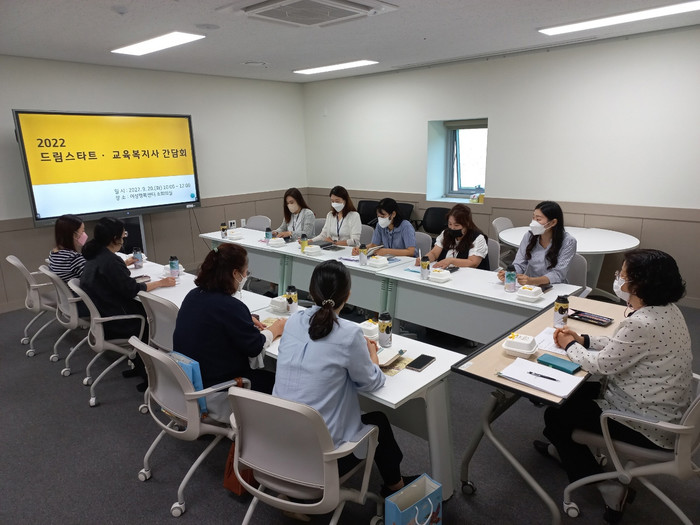 이날 간담회에는 드림스타트 팀장, 복지·보육조정자, 아동통합사례관리사와 지역내 4개교 교육복지사 등 14명이 참석했다.