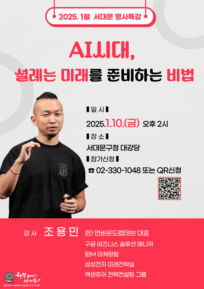 ‘서대문 명사 특강’은 누구나 들을 수 있으며 희망자는 포스터의 QR코드로 접속하거나 서대문구청 행정지원과)로 전화해 신청하면 된다.