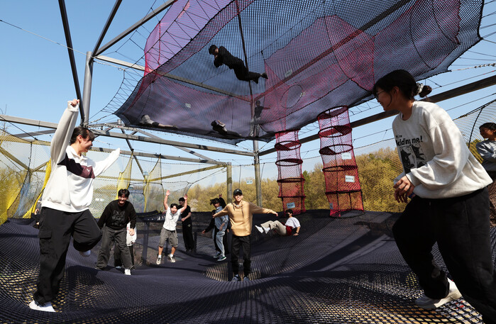 | ▲ 청소년들이 ‘불암산 더불어숲 체험장’ 프로그램인 네트플레이를 이용하고 있다. (사진=노원구청 제공) |