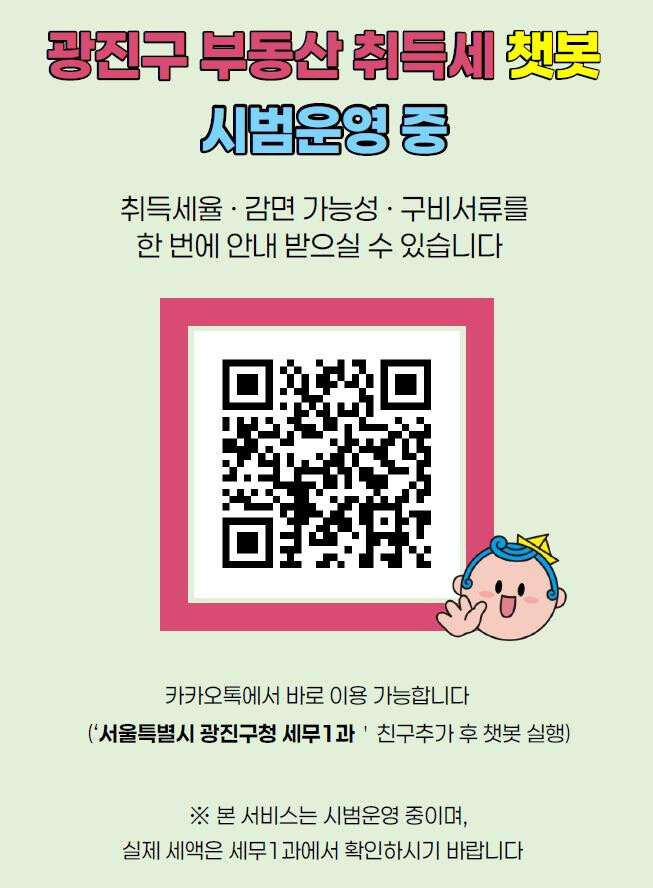 [시민일보 = 여영준 기자] 광진구(구청장 김경호)가 부동산 정책 변화에 따른 취득세 감면 확대와 직접 신고 증가에 대응하기 위해 카카오톡 기반 ‘부동산 취득세 안내 채팅로봇’을 시범 운영한다.