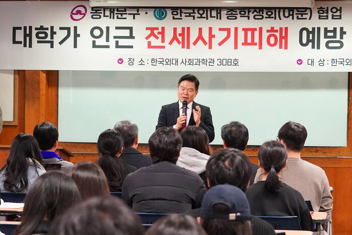 | ▲ 이필형 동대문구청장이 지난해 한국외대 사회과학관에서 열린 전세사기 피해 예방 교육에서 부동산 교육의 필요성을 설명하고 있다. (사진=동대문구청 제공) |