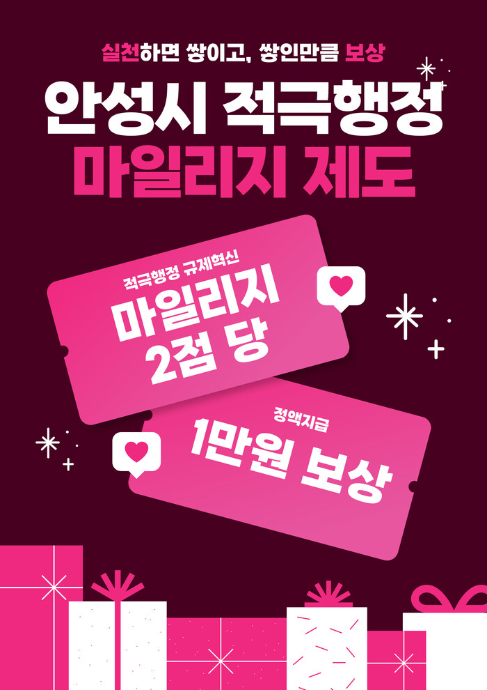 [안성=오왕석 기자] 안성시는 불합리한 규제 개선과 시민 불편 해소를 위한 적극행정 실천 보상을 위해 ‘2026년 적극행정 마일리지 제도’를 운영한다.