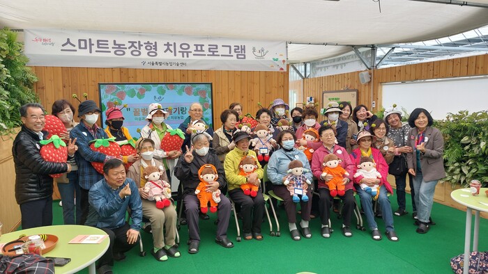 | ▲ 지난 4월 16일 홀몸 어르신들이 ‘AI반려로봇 효손이’와 함께 한 스마트농장형 치유프로그램 (사진=송파구청 제공) |