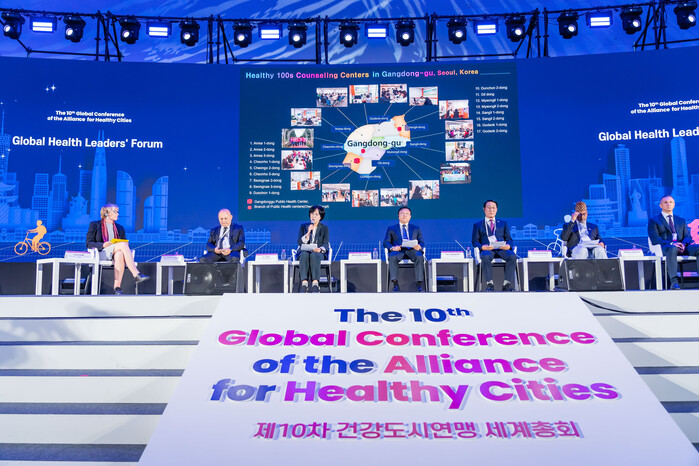 | ▲ 제10차 건강도시연맹 세계총회에서 강동구 정책을 발표하고 있는 이수희 구청장(왼쪽 세 번째). (사진=강동구청 제공) |