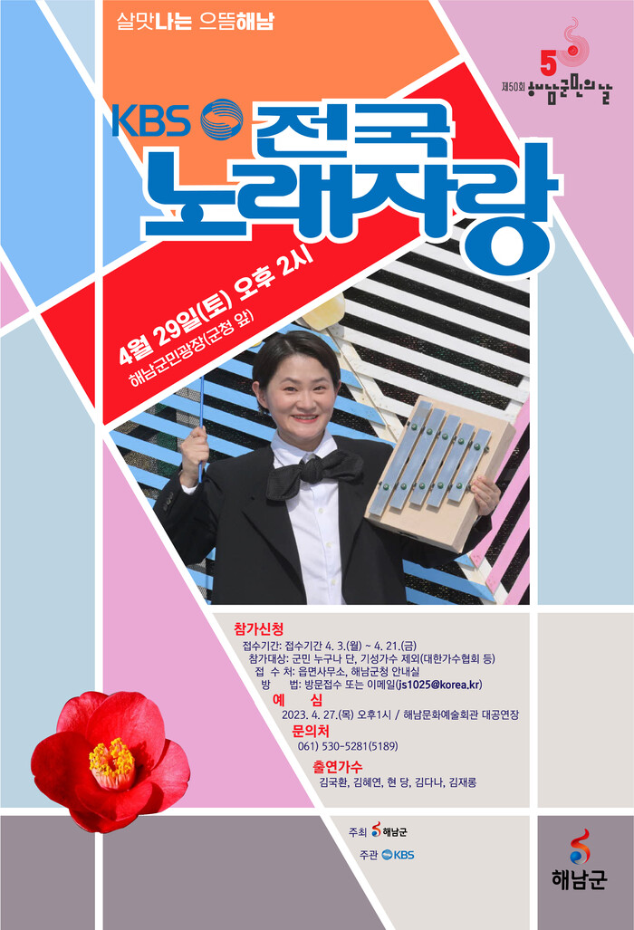 군 관계자는 “2019년 이후 4년 만에 해남에서 열릴 전국노래자랑이 코로나19로 피로감을 느끼는 군민에게 다시 활력을 제공하고, 군민 소통과 화합의 무대가 되기를 희망한다”며“더불어 인기 가수들의 등용문이 되고 있는 노래자랑에도 많이 참여해 재능과 끼를 펼치시길 바란다.”고 말했다.
