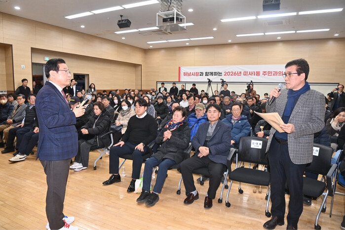 | ▲ ‘2026 미사1동 주민과의 대화’에서 이현재 시장(왼쪽)이 미사1동 주민들의 건의사항을 경청하고 있다. (사진=하남시청 제공) |