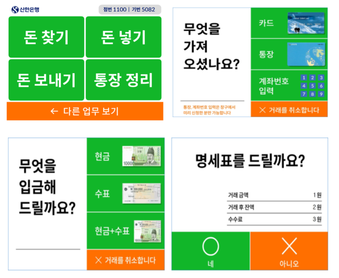 한편 신한은행은 지난 12월에 고령층 고객의 금융 편의성 증대를 위해 금융권 최초 시니어 고객을 위한 디지털 맞춤 영업점을 신림동에 열고 ▲업무목적에 따라 컬러 유도선 설치 ▲간편업무 창구 사이에 스마트 키오스크 설치 ▲시니어 고객을 위한 디지털 맞춤 화면을 적용했다. 또한 고령층 고객을 위한 비대면채널 이용을 안내하는 금융교육 프로그램도 운영하고 있다.