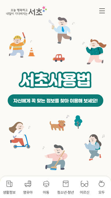 ‘내 손 안의 서초사용법’은 서초구 생활에 필요한 정보를 ▲생활정보 ▲모두(구민 누구나 이용 가능한 시설 등 정보)와 함께 연령별로 ▲영유아 ▲아동 ▲청소년·청년 ▲노인 등 총 6개 분야로 나눠 하나의 웹페이지로 제작했다.