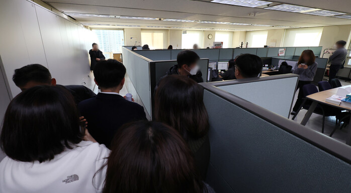 | ▲ 경찰 수사관들이 15일 방송통신심의위원회 내부 직원이 민원인의 개인정보를 유출했다는 의혹과 관련해 서울시 목동 한국방송회관에 있는 방송통신심의위윈회 민원상담팀 등을 압수수색 하고 있다. (사진=연합뉴스 제공) |