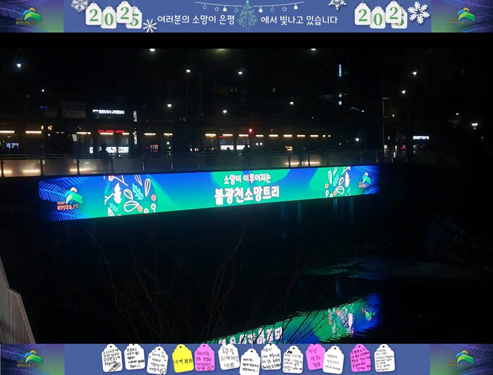 [시민일보 = 이대우 기자] 은평구(구청장 김미경)는 지난해 겨울 진행된 ‘소망이 이루어지는 불광천 소망트리’ 이벤트에서 주민들이 작성한 소망 메시지를 불광천 미디어브릿지를 통해 영상으로 내달 12일까지 송출한다고 밝혔습니다.