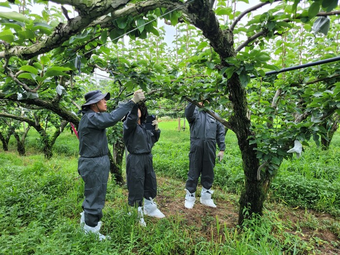 영암군 예찰점검반은 배·사과 재배 농가를 찾아 병해충 감염 여부를 정밀하게 살피고 있다. 이상징후가 보이는 과수에는 간이 진단키트를 사용해 바로 병을 진단한다.