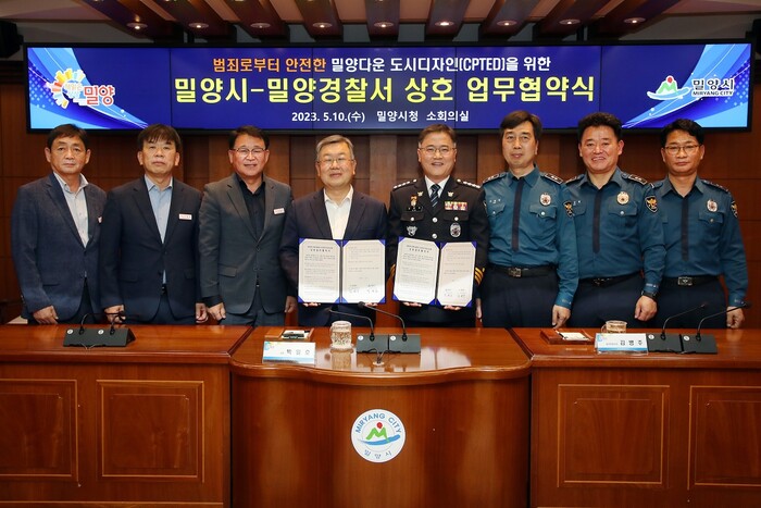 [밀양=최성일 기자] 밀양시와 밀양경찰서는 10일 시청 소회의실에서 셉테드(CPTED: 범죄예방 환경설계)로 안전하고 밀양다운 도시디자인을 위한 상호업무 협약을 체결했다.