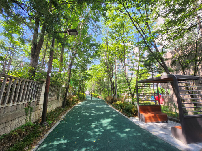 | ▲ 용인특례시 수지구 수지중·풍덕초 통학로에 노후 바닥을 교체하고 지붕 있는 벤치를 설치해 시민 휴식 공간을 마련 |